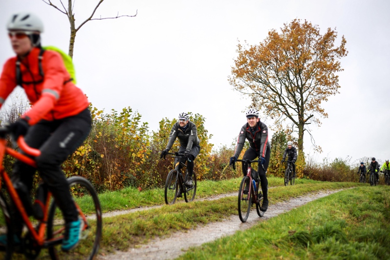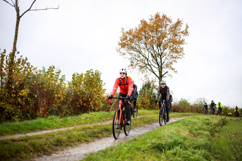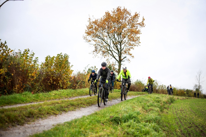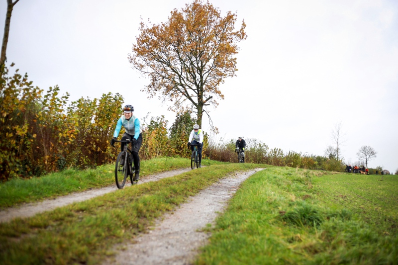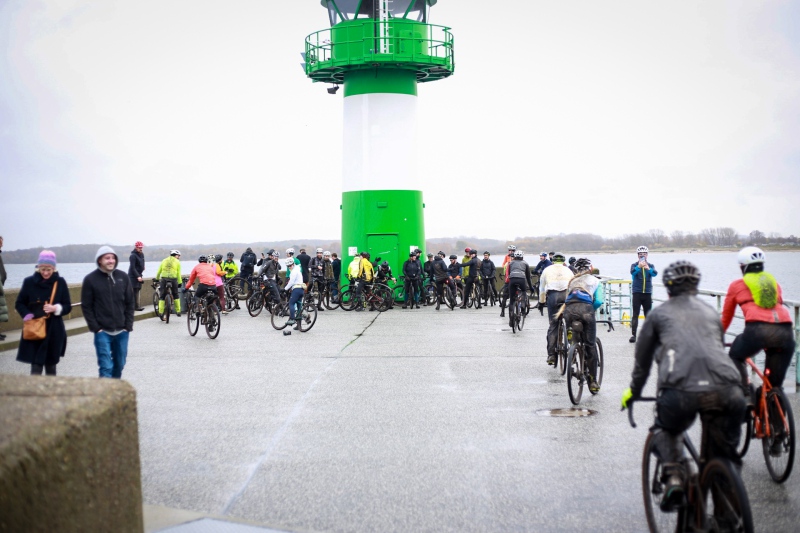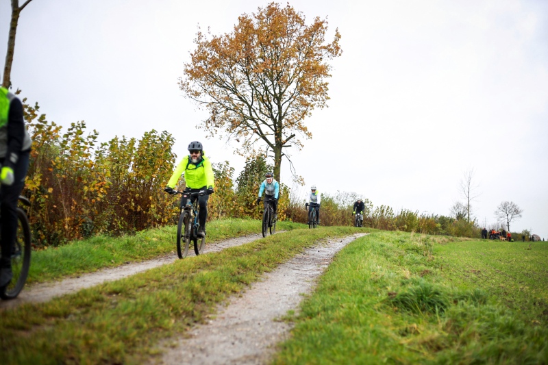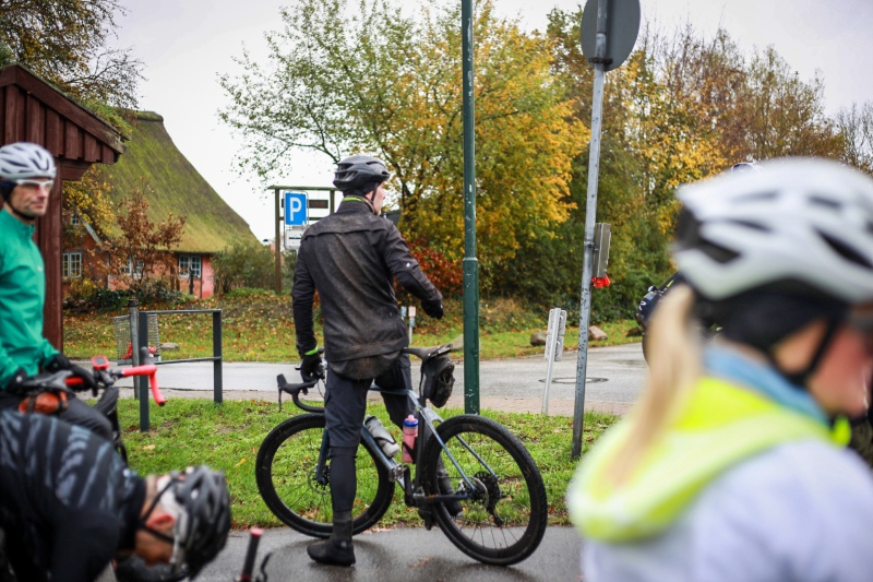 Alle anderen Teilnehmer entschieden sich für den 53 Kilometer langen Socialride „Die Tour mit Aussicht“ Diese führte durch den Bad Schwartauer Kurpark Richtung Riesebusch. Über ein paar Baumwurzeln, dicken Laubschichten und durch große Pfützen ging es durch den ansonsten stillen Wald. Weiter ging es dann über Ratekau bis Groß Timmendorf auf einer ruhigen Nebenstraße. Nach ca. 3 Kilometern dann kam eine große Spitzkehre und es ging weg vom asphaltierten Weg auf die landwirtschaftlich genutzten Feldwege. Hier war die Freude aller Teilnehmer groß. Denn es kamen große Pfützen und tiefer Matsch. Es war die matschigste Passage der Tour. Wir überquerten einen Bauernhof, der Landwirt stand draußen und wunderte sich über die große Gruppe und schmunzelte ein wenig, da wir alle schon ziemlich schmuddelig aussahen. Er wünschte uns weiterhin viel Spass und gutes Gelingen.