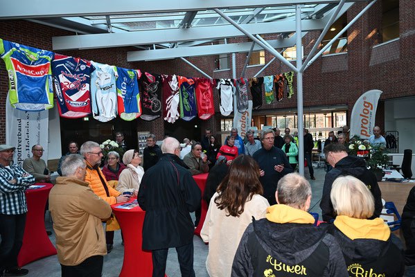 Am 23. November 2024 trafen sich um 10:30 Uhr die Vertreter der NordCup-Vereine im Gebäude der Sparkasse Mittelholstein AG in Rendsburg. Es wurde über die vergangene Saison gesprochen und die neue Radmarathon-Saison 2025 vorbereitet. Dann ging es an die Vorbereitungen des Events der Finisher-Siegerehrung. Es wurden die Räumlichkeiten dekoriert, die Anmeldeliste nochmal kontrolliert, die Preise der Tombola aufgebaut, das Foyer für die feierliche Verleihung vorbereitet und das Catering im S-Markttreff drapiert. Ab 13:45 Uhr trafen die ersten Gäste ein und konnten bei leckerem Essen und lockeren Gesprächen die Zeit bis zur Verleihung verbringen. Wer mochte, konnte sich von Michael Schmidt von prolog cycling wear beraten lassen und nach Herzenslust bei seinem Stand einkaufen, oder am Infostand bei Heiko Lehmann (The Perfect Getaway) zu den Themen Bike-Fitting und Leistungsdiagnostik informieren. Der Höhepunkt des Events fand dann eine Etage höher ins Foyer der Sparkasse Mittelholstein statt. Die feierliche Verleihung der Nord Cup Trikots 2024 an der insgesamt etwa 120 Sportlerinnen und Sportler teilnahmen. Neben Rück- und Ausblicken galt es, den veranstaltenden Vereinen für ihre tolle Organisation der einzelnen Veranstaltungen zu danken.